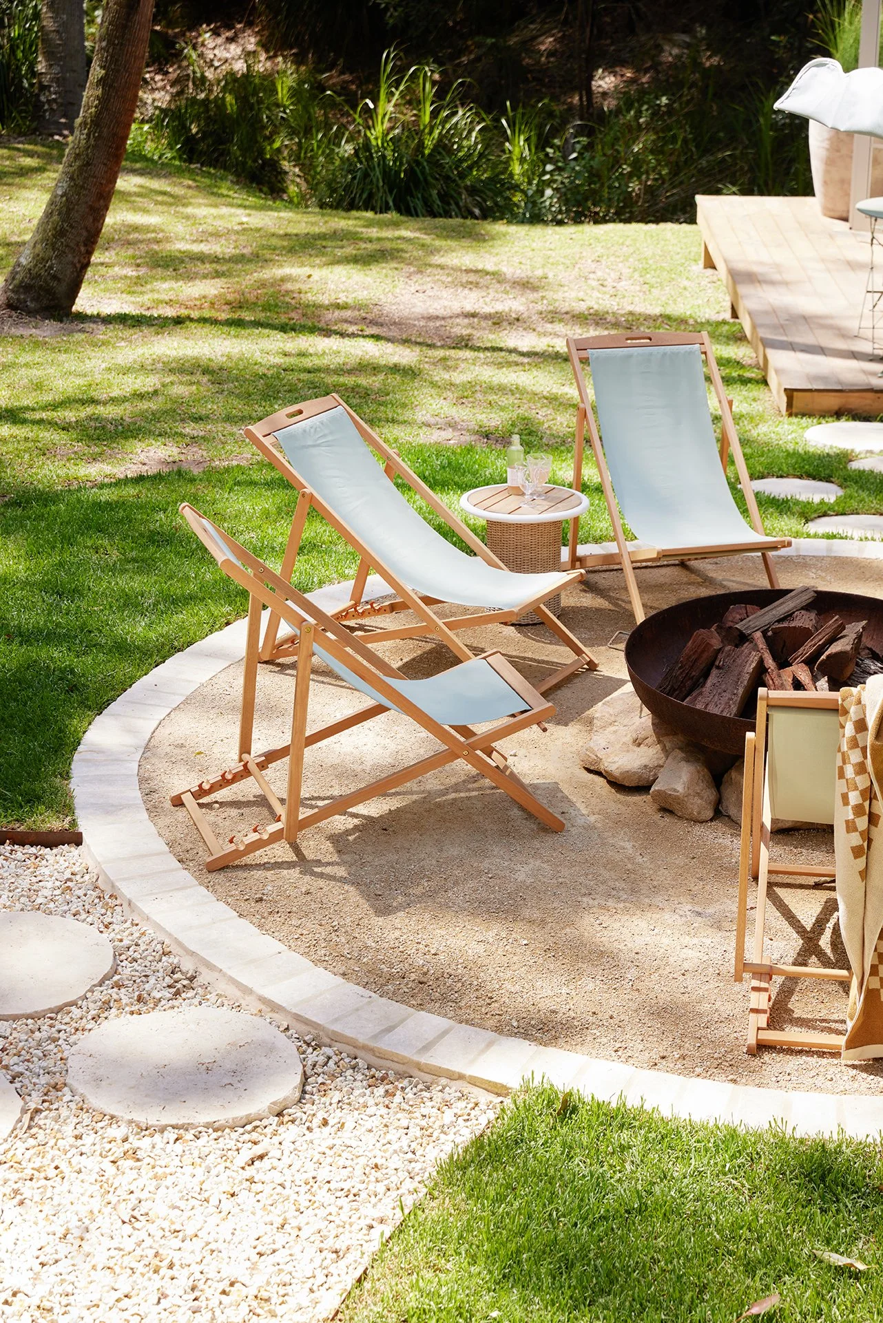 Outside, Travertine Pavers in Ivory and matching stepping stones guide you through the garden and frame the firepit zone. Their natural variation keeps everything soft and earthy, helping the transition between inside and out feel effortless – just as a holiday home should.