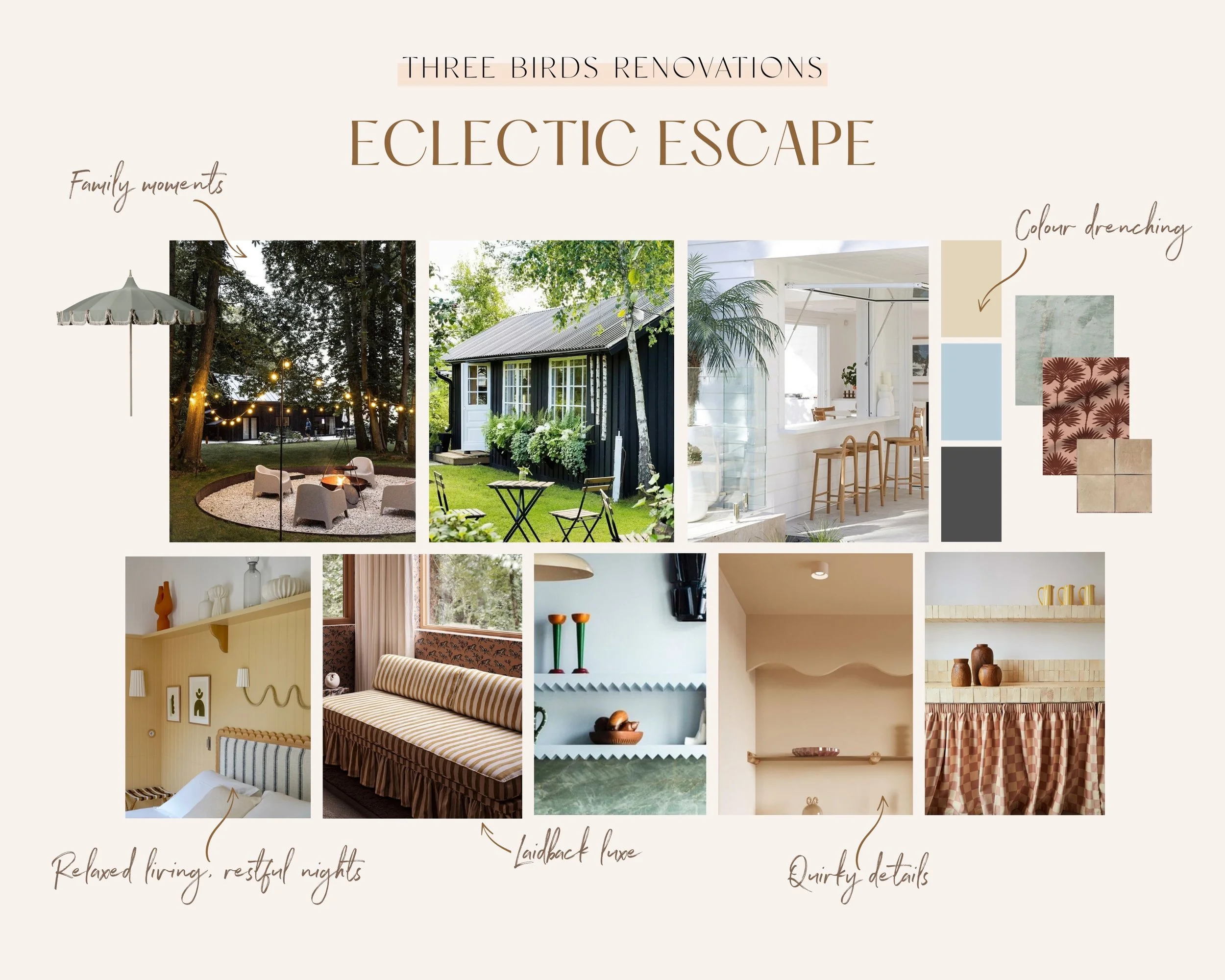 Every Three Birds project starts with a vision board, and for The Eclectic Escape, pops of colour were part of the plan from day one. We wanted the house to feel relaxed, layered and happy – a true holiday escape where time slows down and summers seem to stretch on forever.