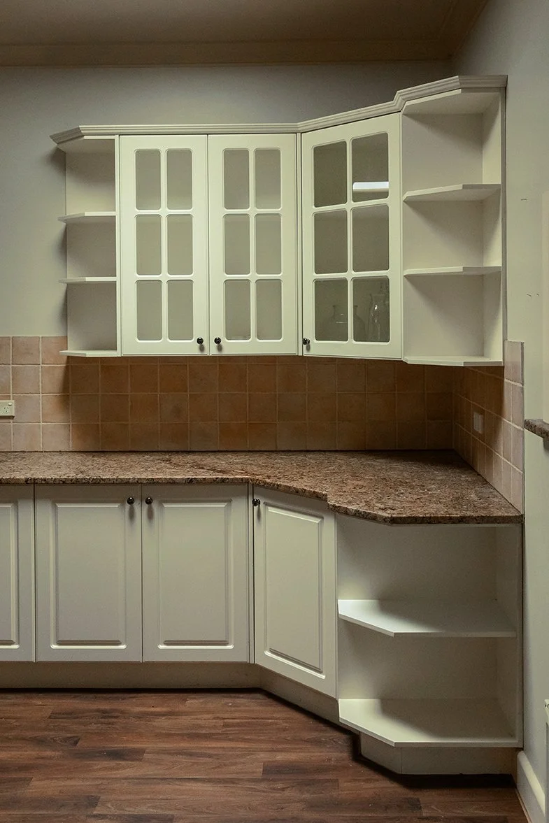 Instead of starting from scratch, we gave the original cabinets a fresh new look with a lick of paint, upgraded the appliances, and added a cosy café-style dining nook to dial up the farmhouse charm.